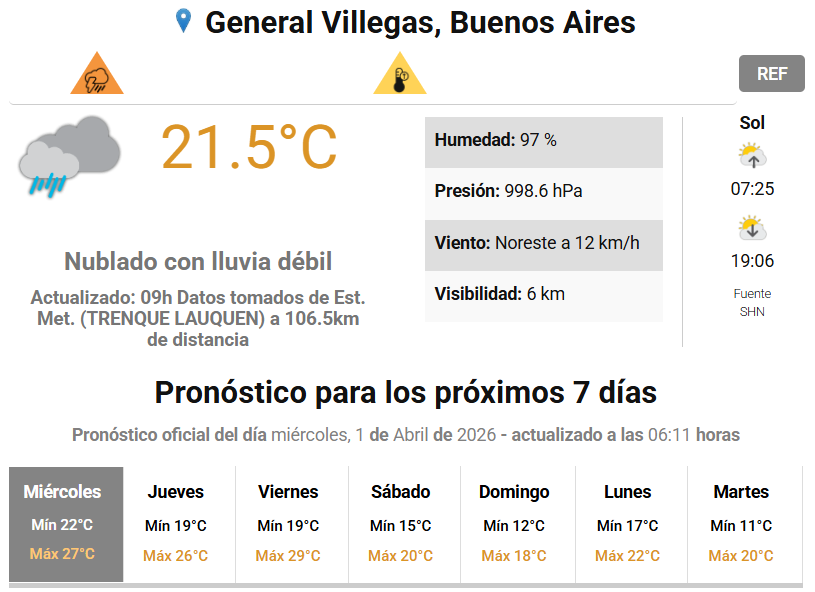 Se espera que este miércoles durante la jornada completa las lluvias continúen en la región. En General Villegas, el Servicio Meteorológico Nacional pronosticó tormentas fuertes con un 70 a 100 % de probabilidad de lluvias para la mañana y tarde de hoy miércoles, mientras que para la noche y madrugada del jueves, las precipitaciones se establecen entre el 40 y 70 %.